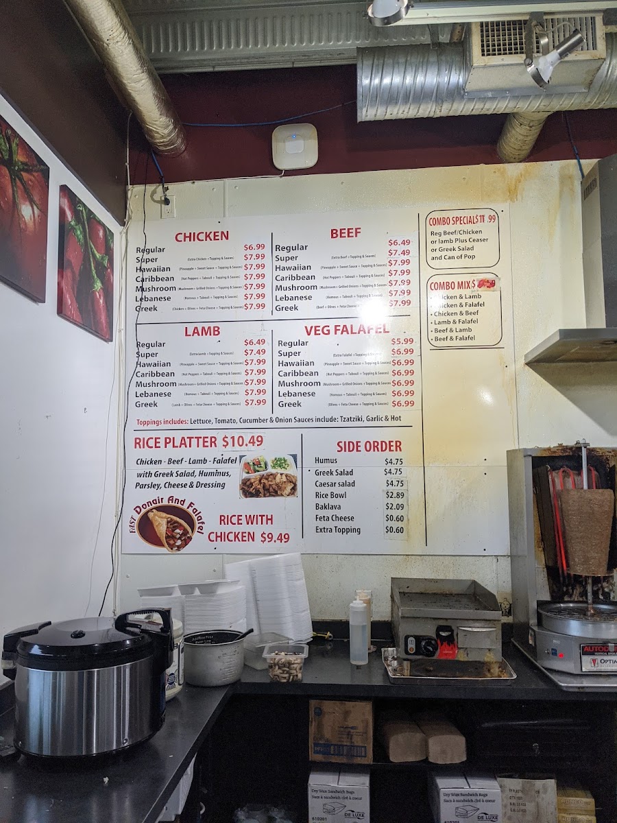 - Beef Donair Wraps: A range of beef wraps featuring styles like Regular, Super with extra beef, Mushroom with mushrooms and grilled onions, Hawaiian with pineapple and sweet sauce, Lebanese with hummus and parsley, and Caribbean variations. These wraps offer a variety of flavors with toppings and sauces included.